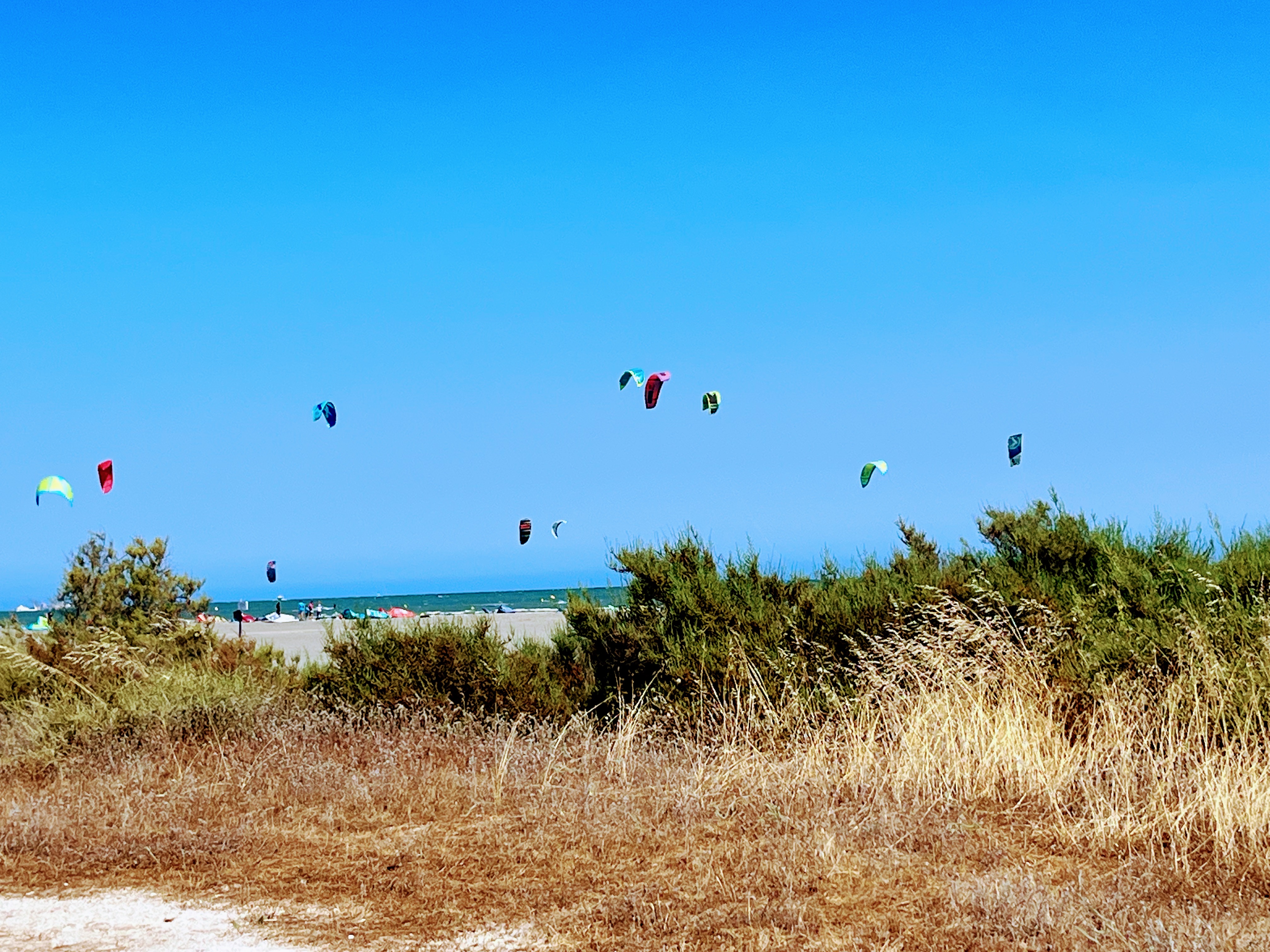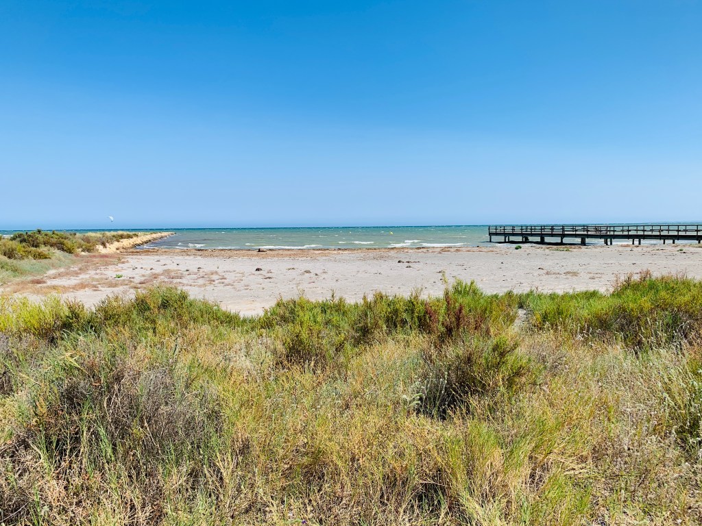 Nous choisissons donc de s’arrêter à la Platja Lissa en y voyant de la route; plusieurs cerf-volants de kitesurf. La plage est également bordée par le parc naturel des salines de Santa Pola.