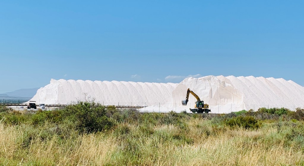 Sur la route, nous croisons quelques flamants et une grosse usine de sel avec des montagnes impressionnantes de sel sur son terrain.