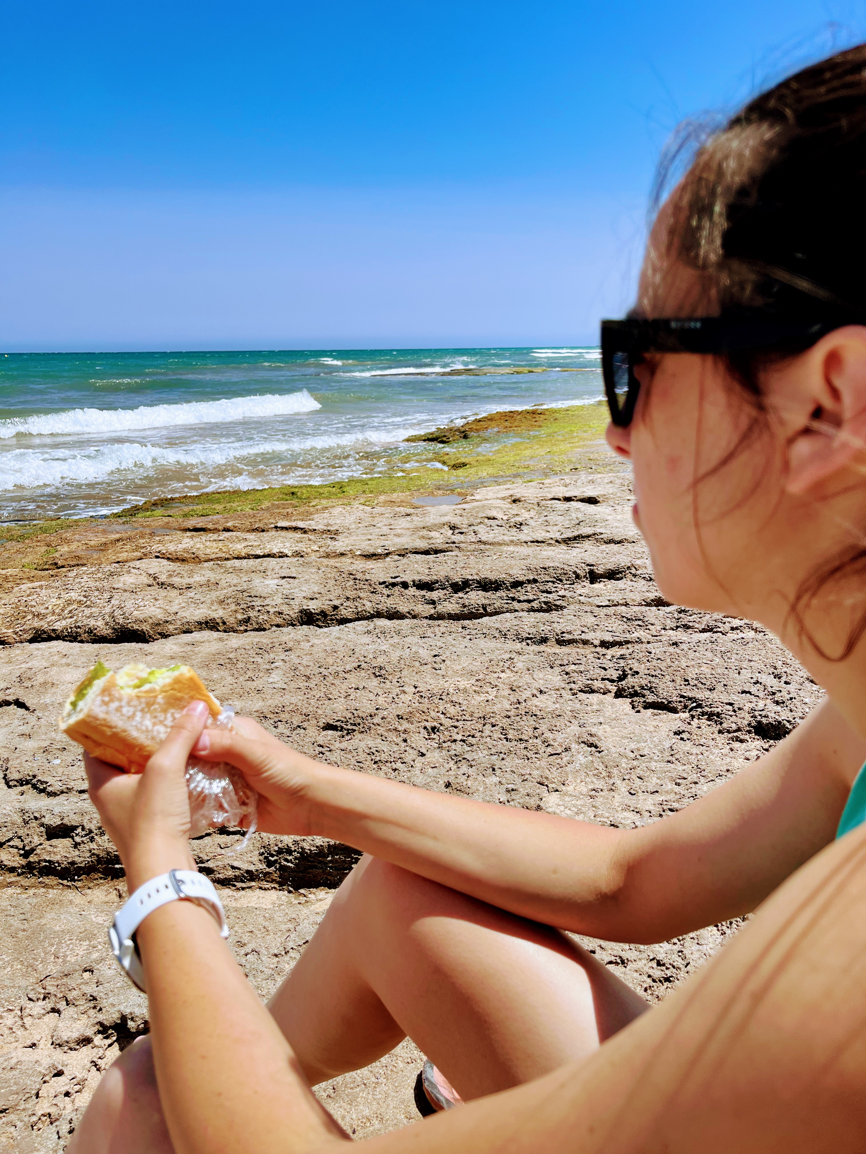 Un peu fatiguées de tourner en rond et de chercher l’endroit, nous décidons plutôt d’emprunter la N-332 (route qui longe la mer) et de se trouver un bel endroit sur notre route pour manger notre petit lunch.