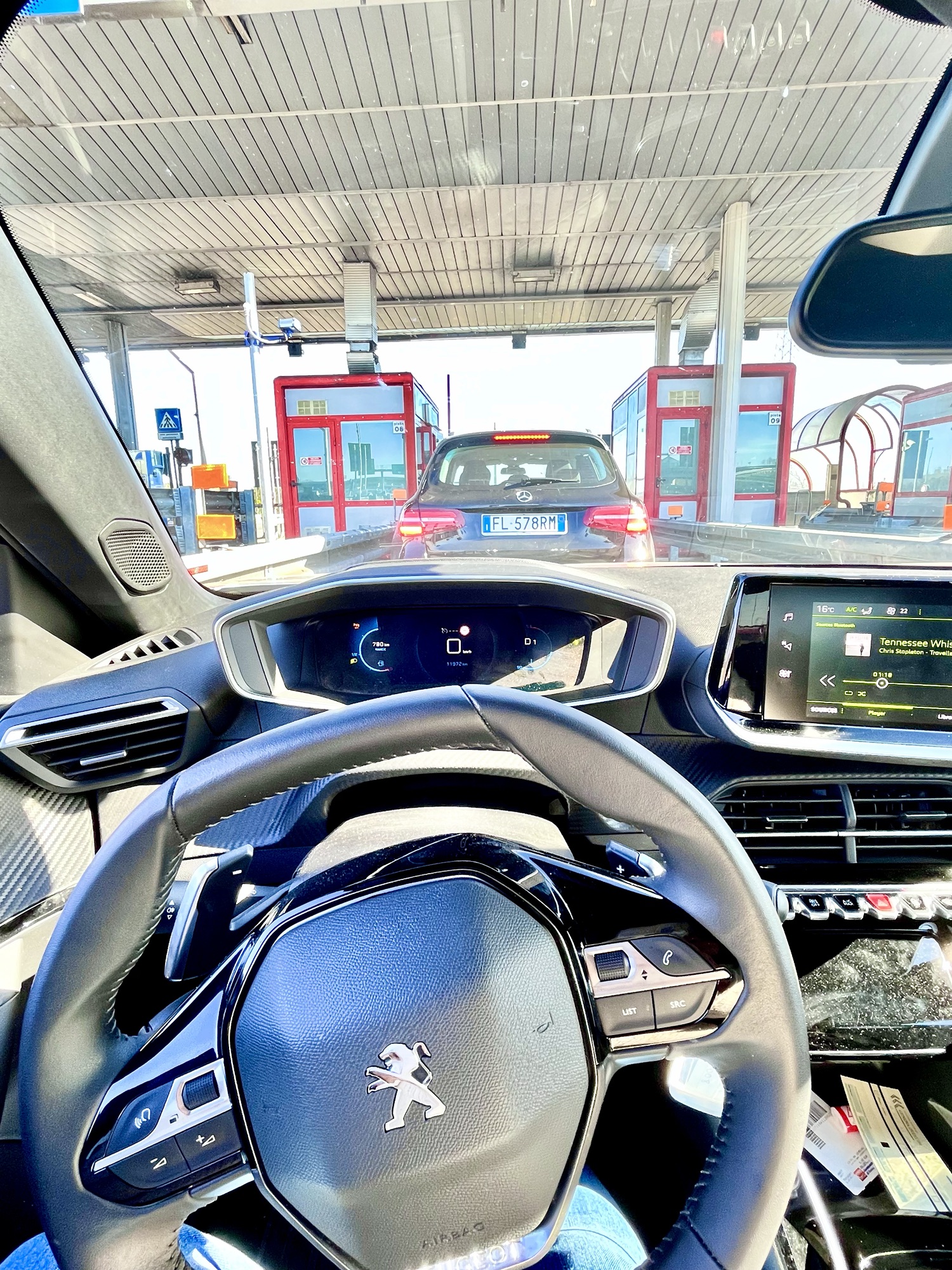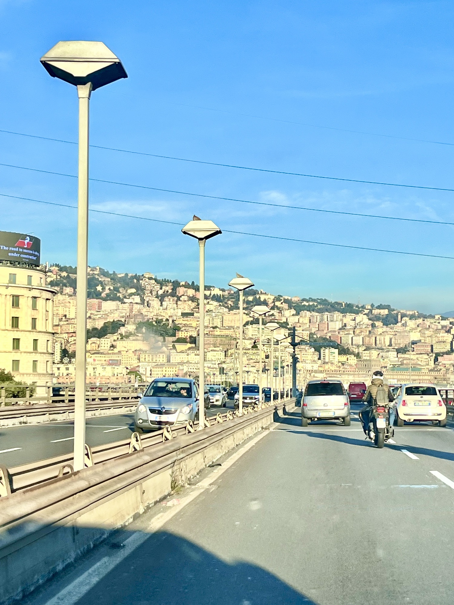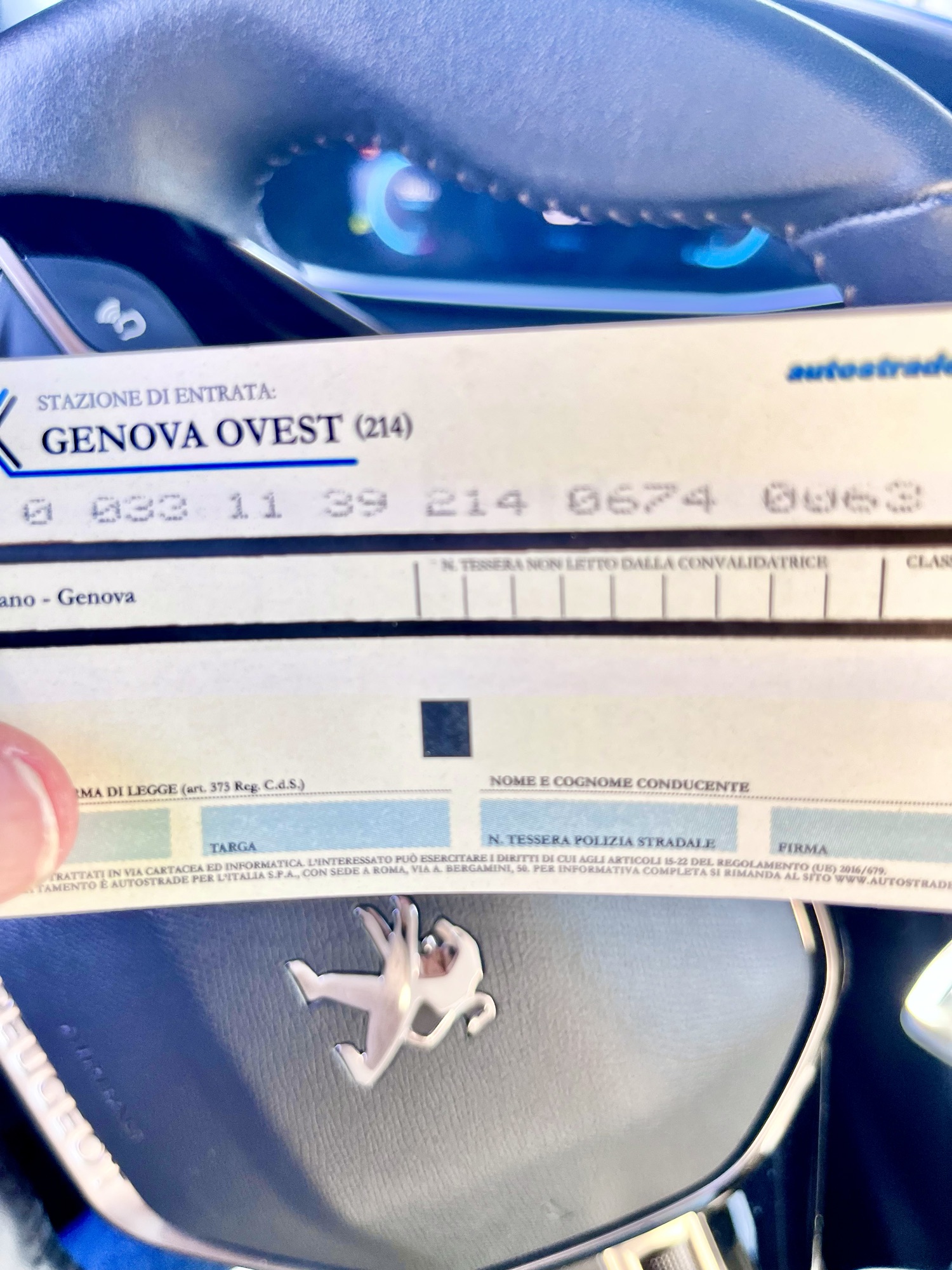 Aussi, j’ai vécu une petite aventure, juste avant d’arriver sur Gênes. Plus tôt sur la route, je suis passée par un espèce de poste de péage avec des barrières. Je me suis arrêtée (pas le choix) et je ne voyais rien, je ne voyais rien qui aurait pu m’indiquer quoi faire et la barrière restait fermée. Comme j’étais seule dans cette ligne, j’ai reculé et oups, la barrière s’est levée! Je me suis dépêchée à passer. 150 km plus loin, j’ai compris…que je devais y prendre un ticket (je me demande encore où). Arrivée au péage, j’avais pas de ticket et il n’y avait personne dans le petit guichet. J’avais 10 voitures derrière moi. J’étais coincée entre la barrière fermée et les gens qui klaxonnaient derrière. Fallait que je lise tout ce qui était écrit sur la machine en italien pour comprendre ce que je pouvais faire. Quand j’ai compris que je pouvais peser sur un bouton pour de l’assistance en italien…hey boy, j’étais contente pareil! Elle rouspétait la donna parce que je n’avais pas de ticket. J’ai finalement réussi à lui expliquer d’où j’arrivais et après un petit moment, elle m’a dit que je pouvais payer avec ma carte, et surtout, elle m’a répété que la prochaine fois, je devais prendre un ticket. J’ai répliqué « comprendo ».