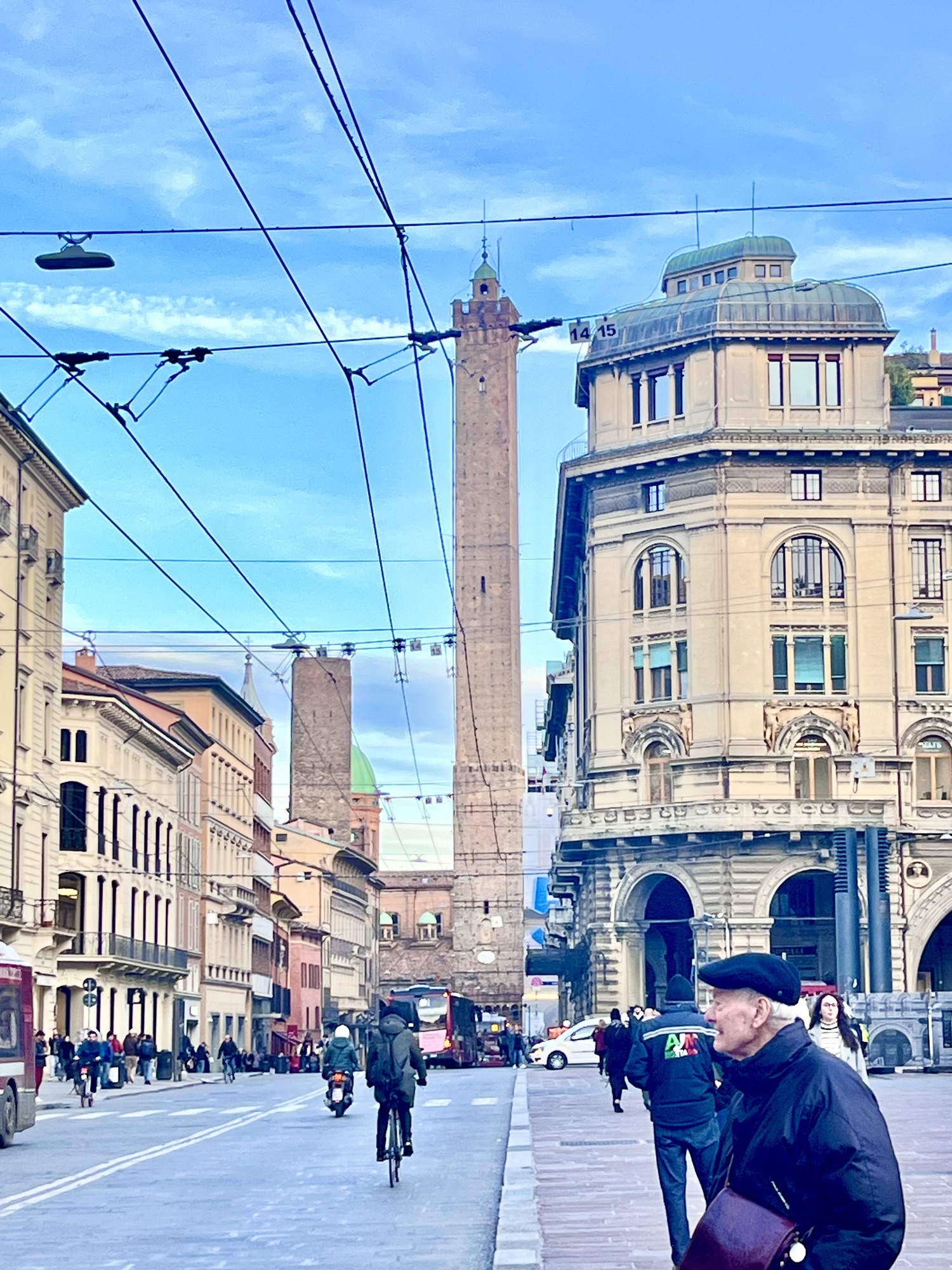 Les tours jumelles Asinelli et Garisenda datent également du Moyen-Âge. Elles sont l’un des symboles de la ville, qui subsistent encore aujourd’hui. La tour « Asinelli » est haute de 97 mètres, ce qui en fait la plus haute de Bologne. Quant à la tour « Garisenda », elle fait 48 mètres avec une bonne inclinaison…elle est donc interdite au public. Un incontournable de Bologne est de gravir les 498 marches menant au sommet de la tour Asinelli. J’ai manqué de temps pour l’escalade.