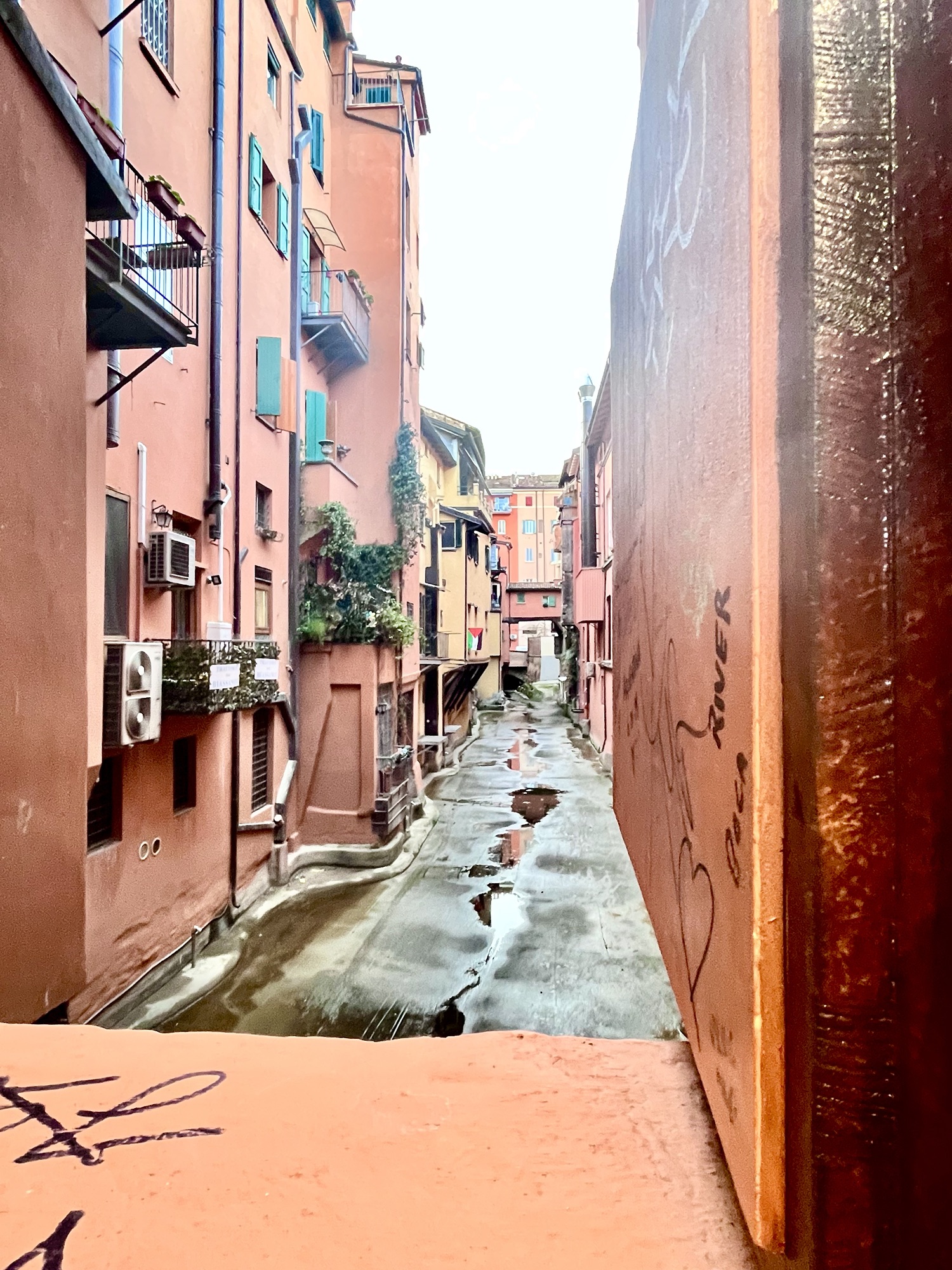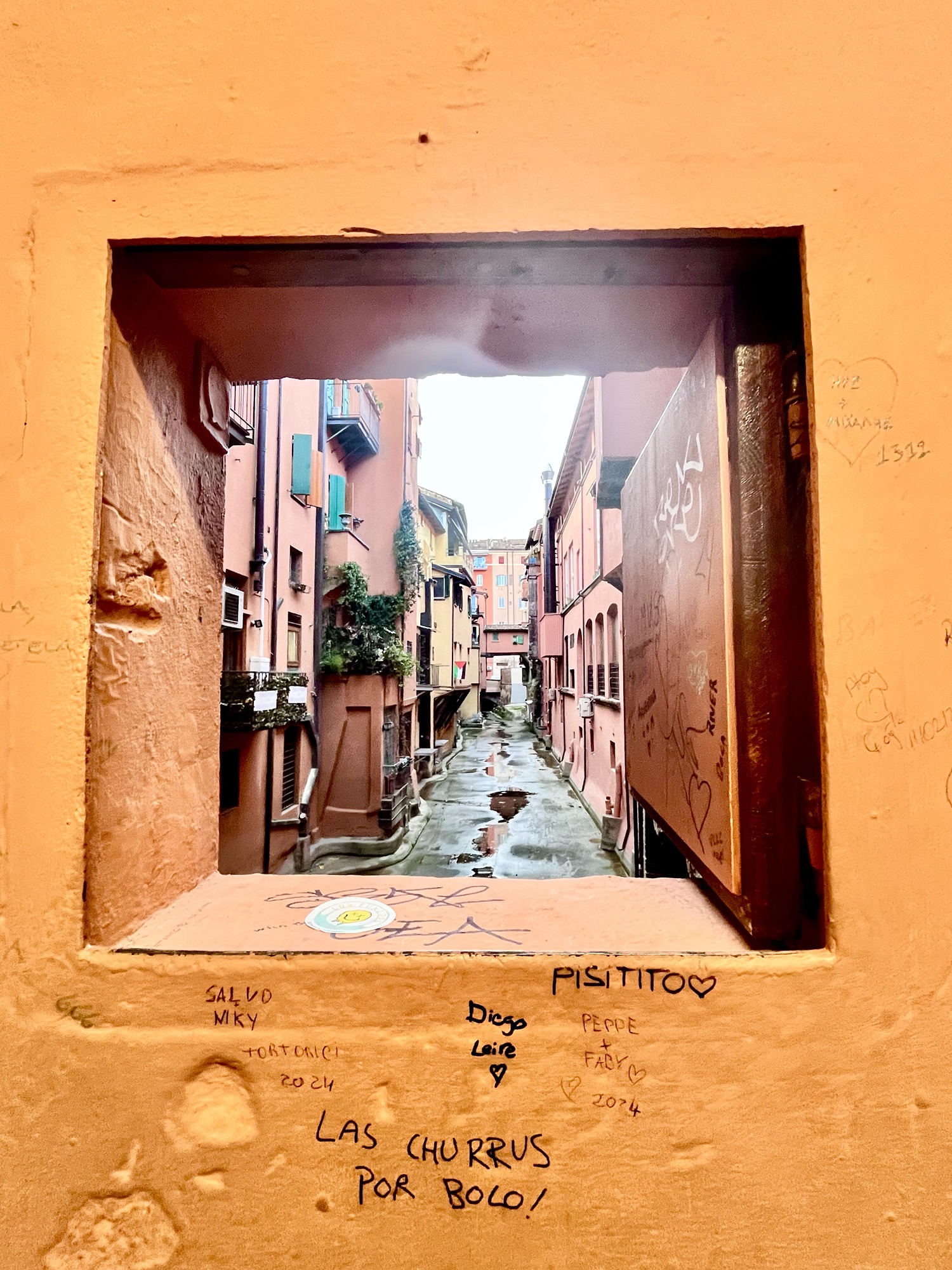 Une toute petite fenêtre ouverte dans un mur, qui laisse entrevoir le système de canaux qui existe à Bologne et qui date du Moyen-Âge.