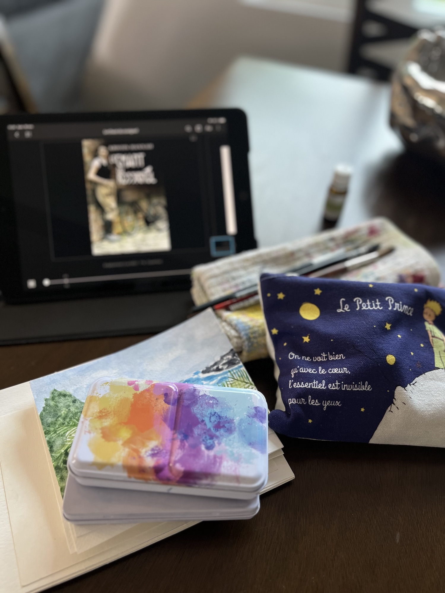 Pour le roman, j’ai sélectionné: « Le chant du rossignol » (excellent) et bien évidemment, mes pinceaux, mes couleurs et mes papiers aquarelles pour mon carnet de voyage!